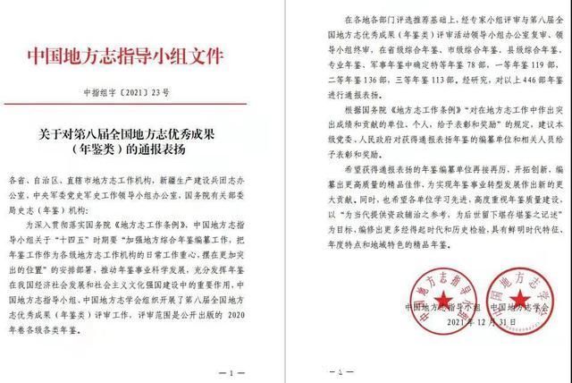 据悉,第八届全国地方志优秀成果(年鉴类)评审采取地方申报、省级初审推选,国家方志领导小组办公室复审、领导小组终审,对446部省级综合年鉴、市级综合年鉴、县级综合年鉴、专业年鉴、军事年鉴进行通报表扬,其中被确定为县级一等综合年鉴的仅35部。